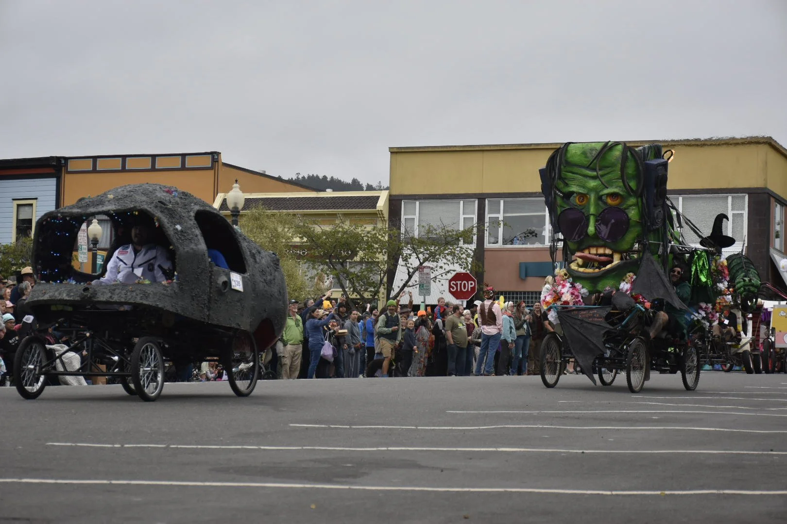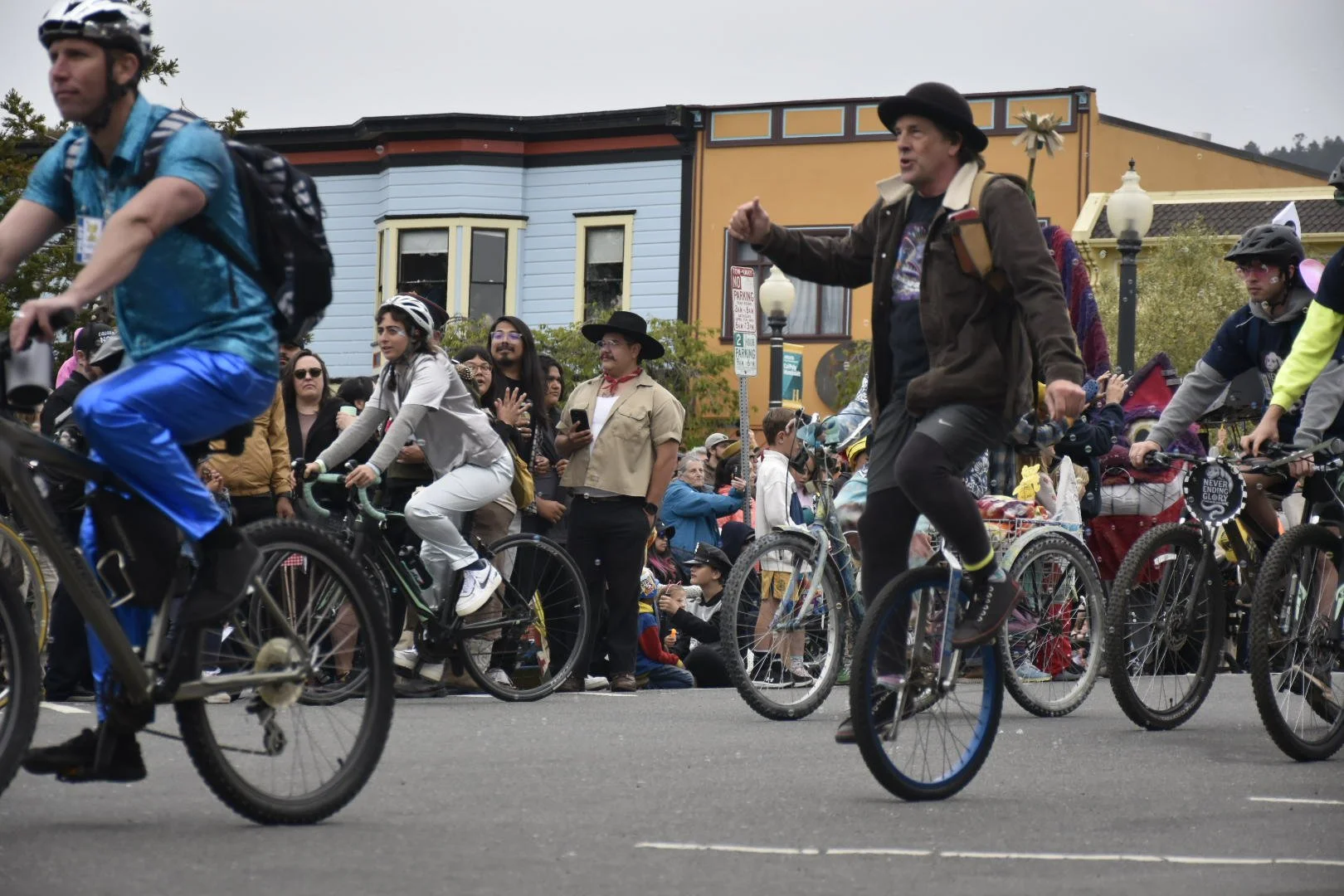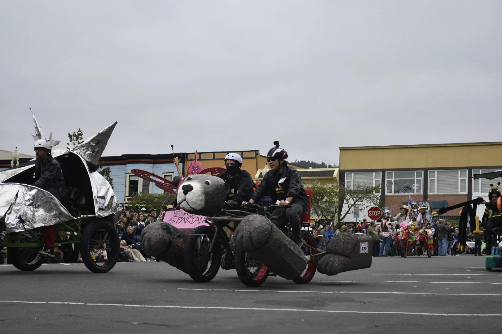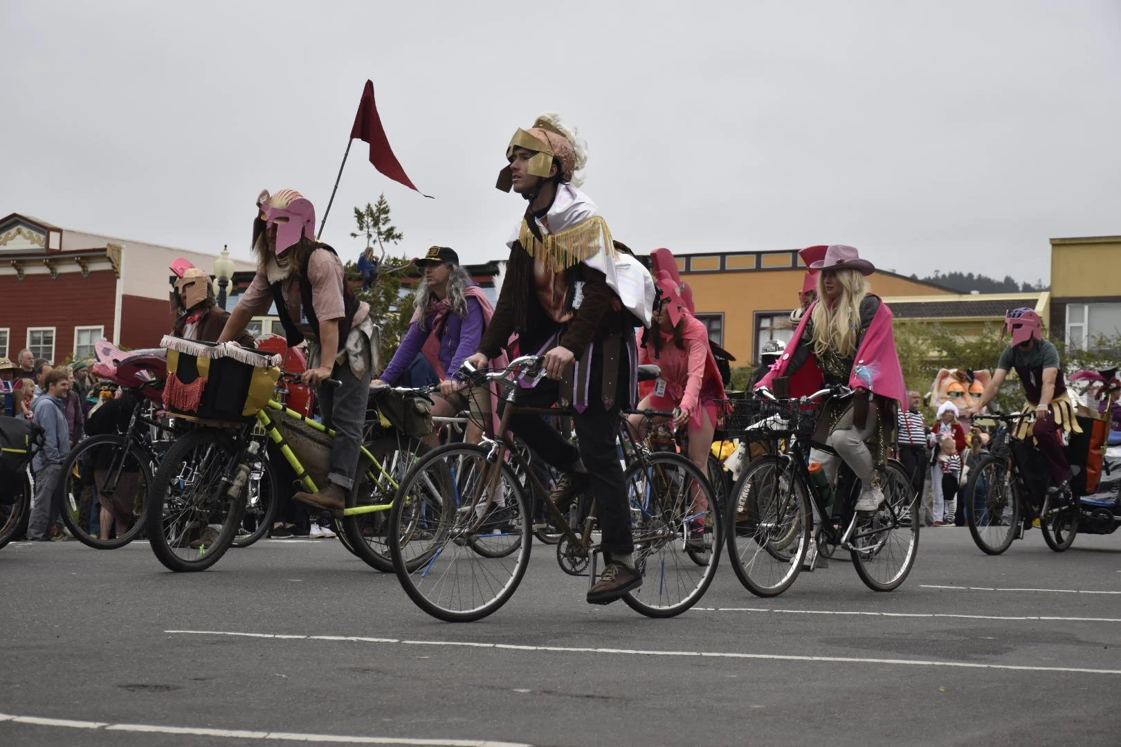 Peons and Pit Crew ride by on cycles of all sorts (Lilly Dewberry)