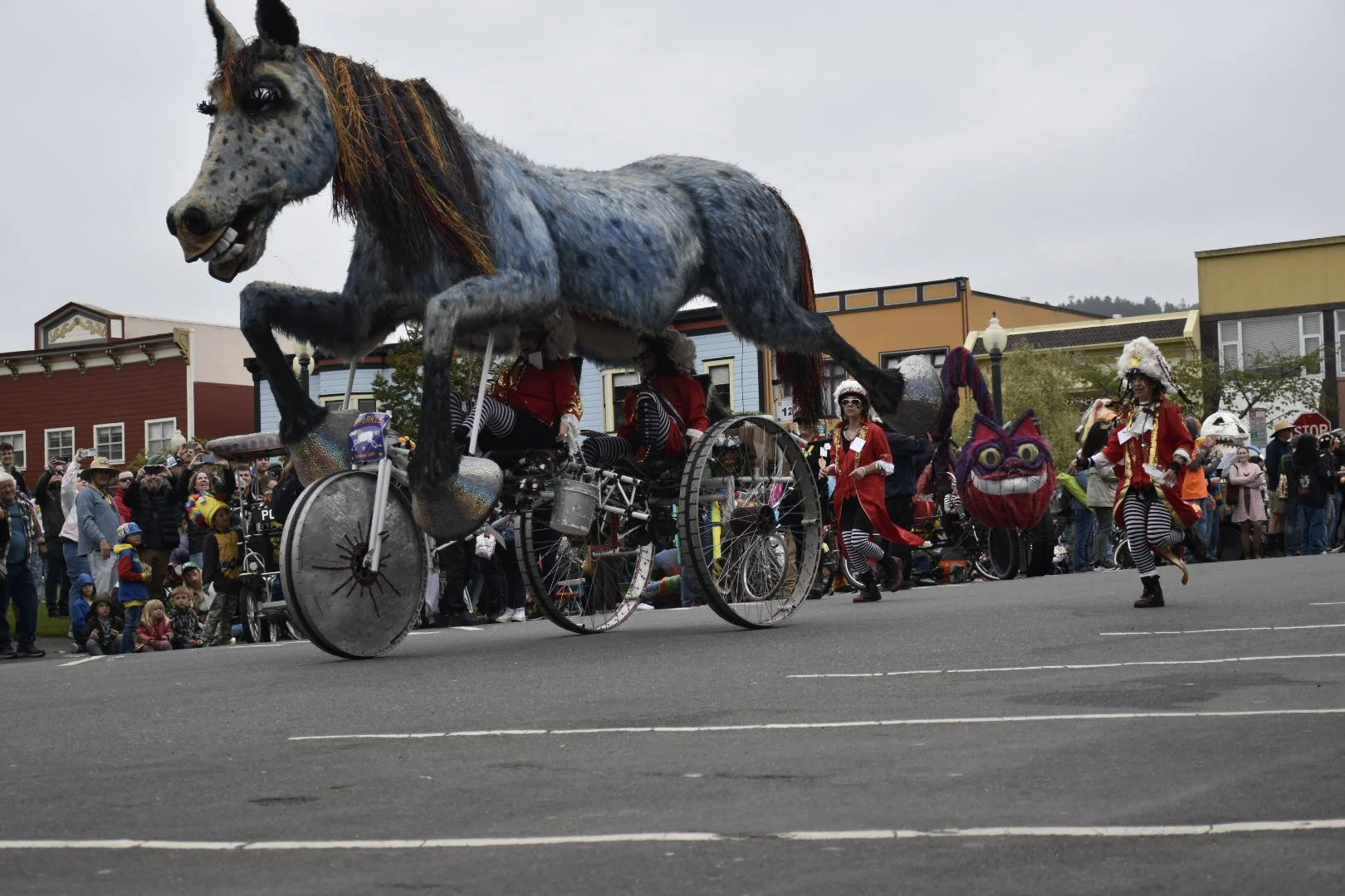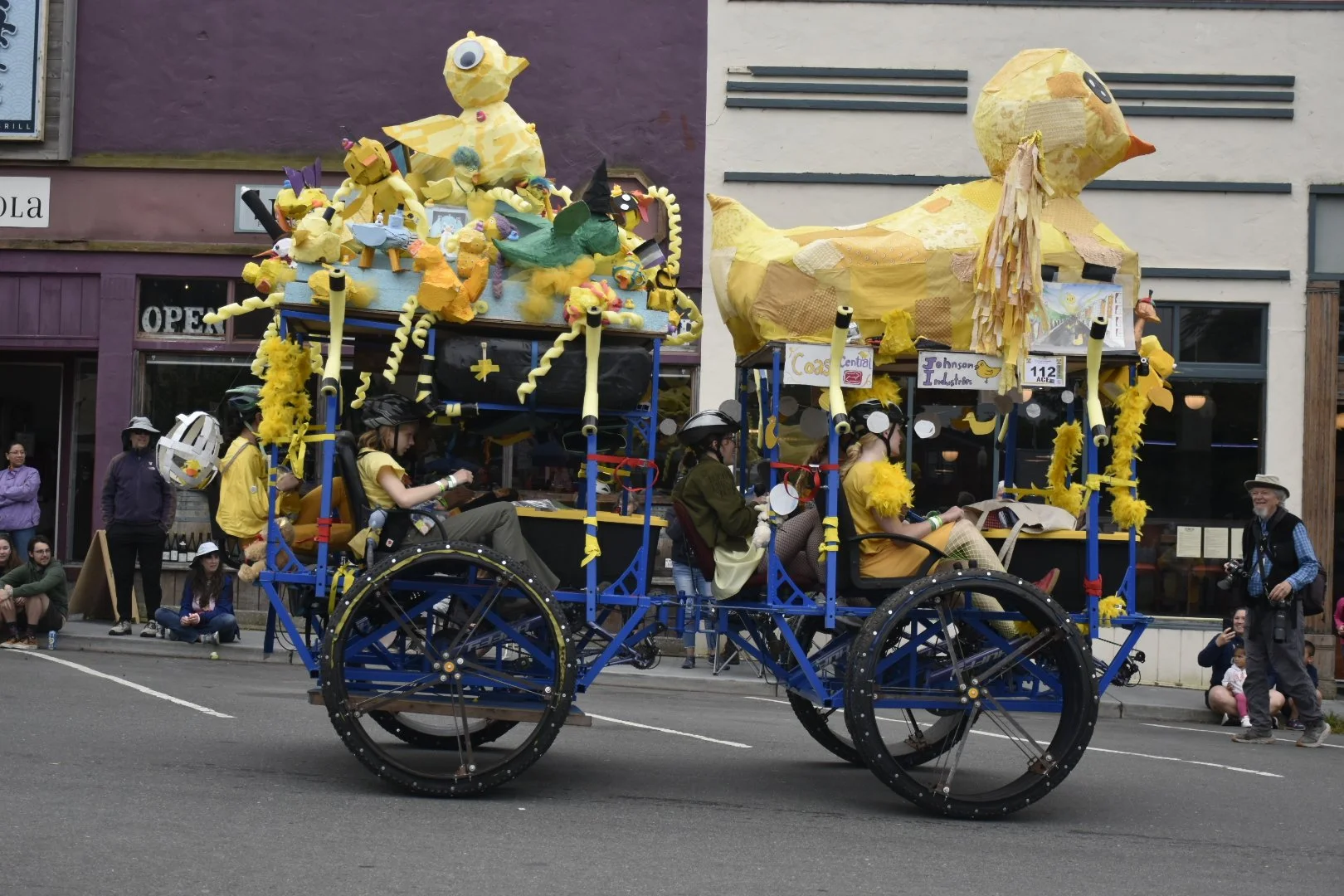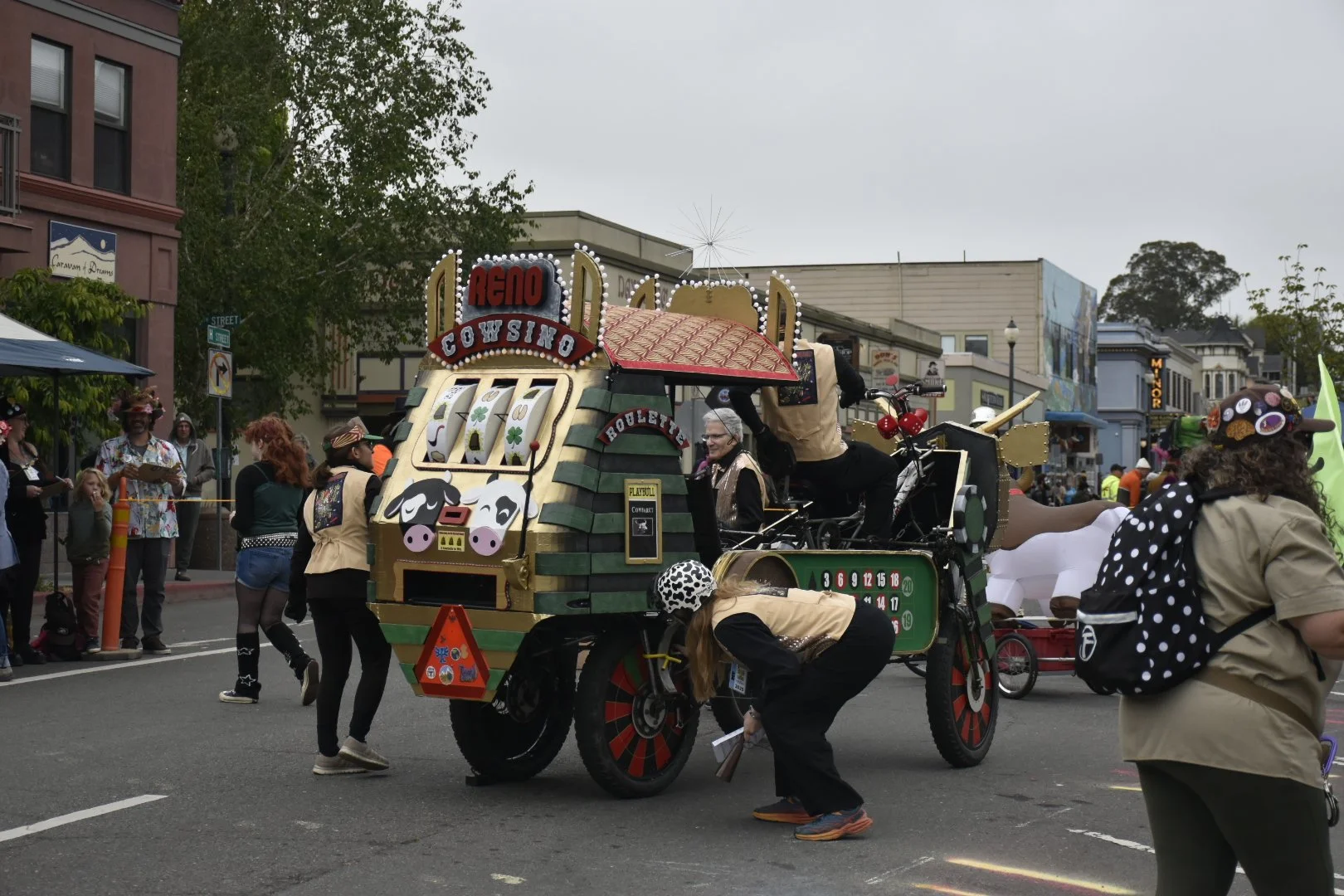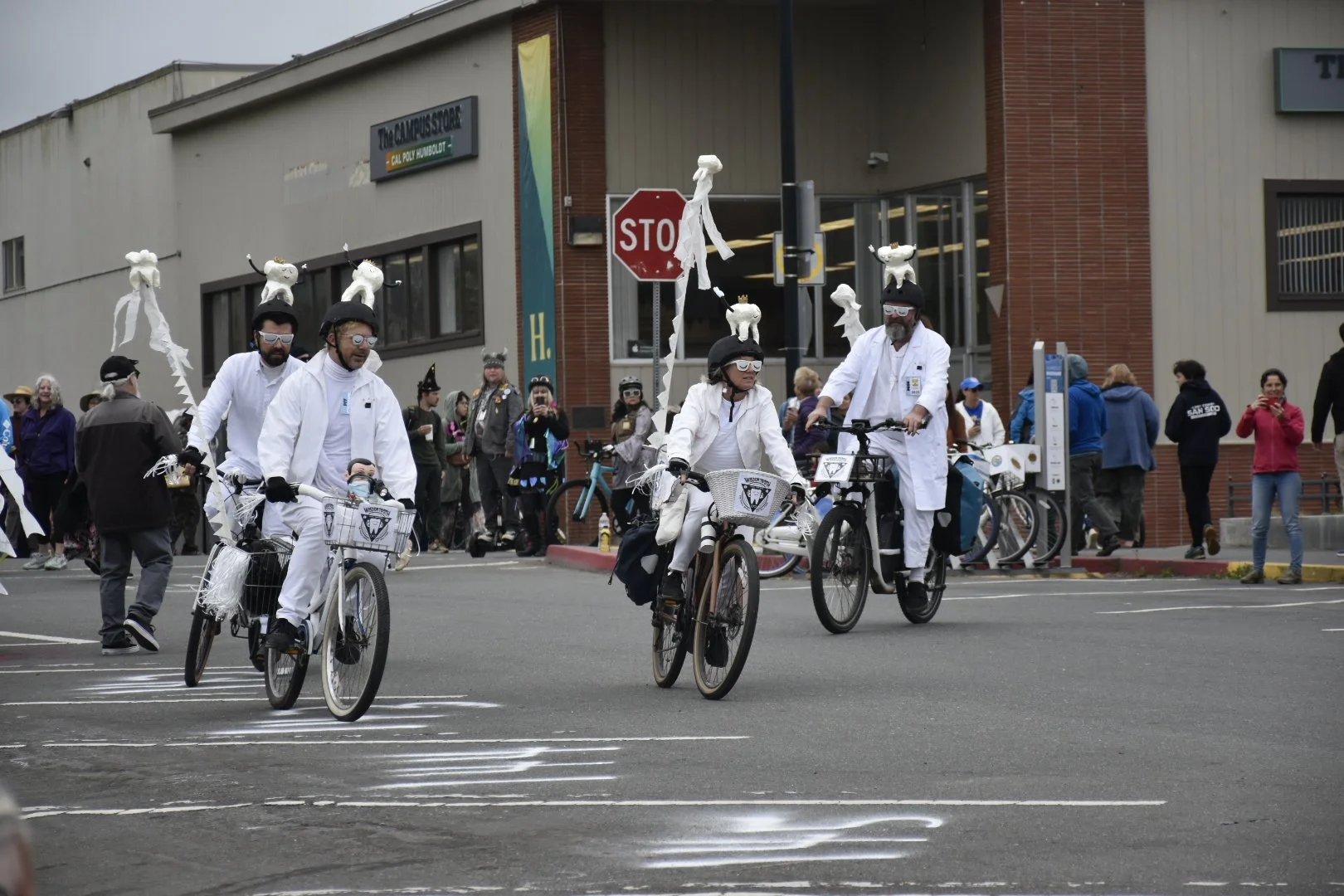 Peons and Pit Crew ride by on cycles of all sorts (Lilly Dewberry)