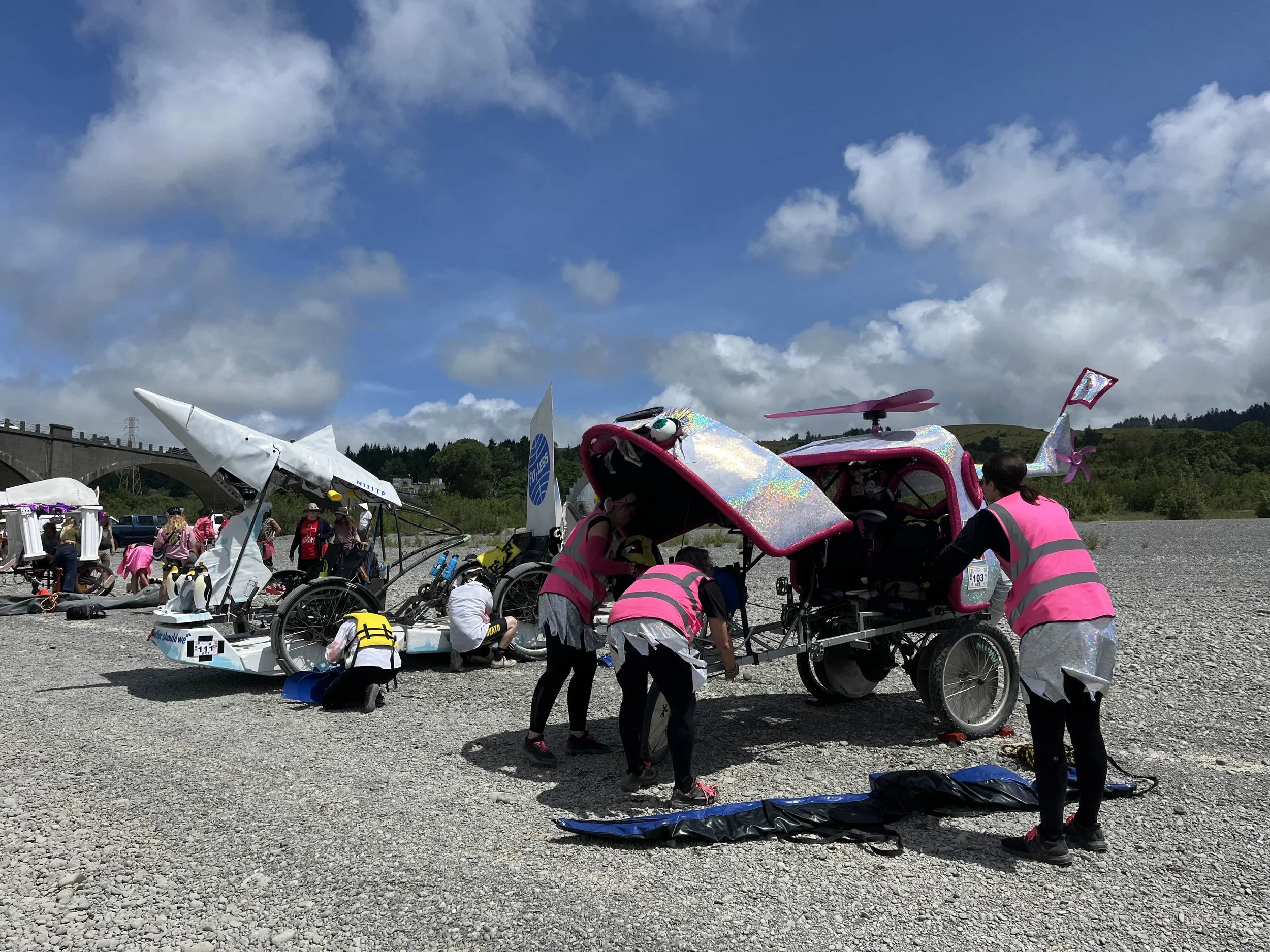 "Dolly Parthenon: Blood Starts Pumping" #134, "FLY t LESS" #111, and "Bunny Hopper Helicopter" #103 preparing to cross the Eel River (Carlina Grillo)